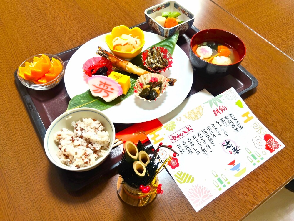 色鮮やかな海老や黒豆といった縁起物が並ぶ豪華なお食事に、食堂からは「わあ、すごい!」「食べるのがもったいないね」と歓声が上がりました。