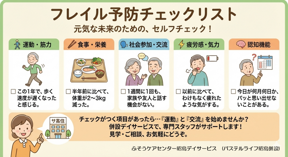 [パステルライフ昭島]では、入居者様がいつまでも自分らしく、自由な生活を謳歌できるよう、このフレイル予防に全力で取り組んでいます。