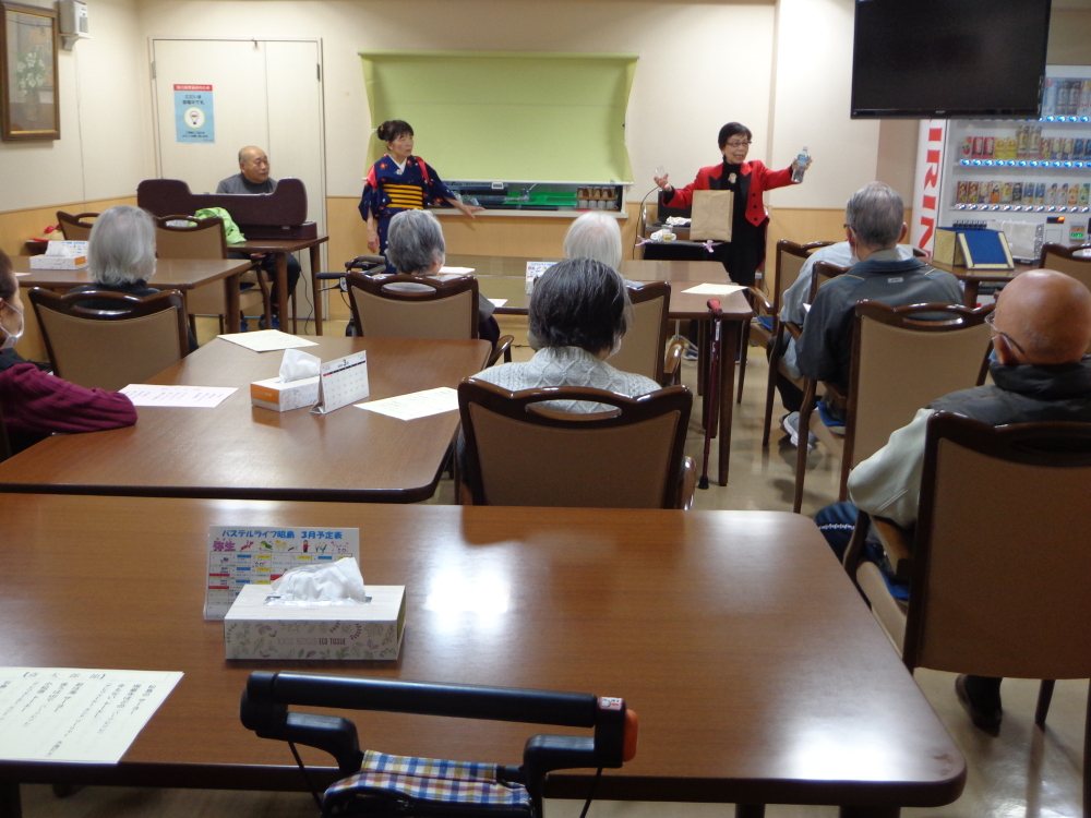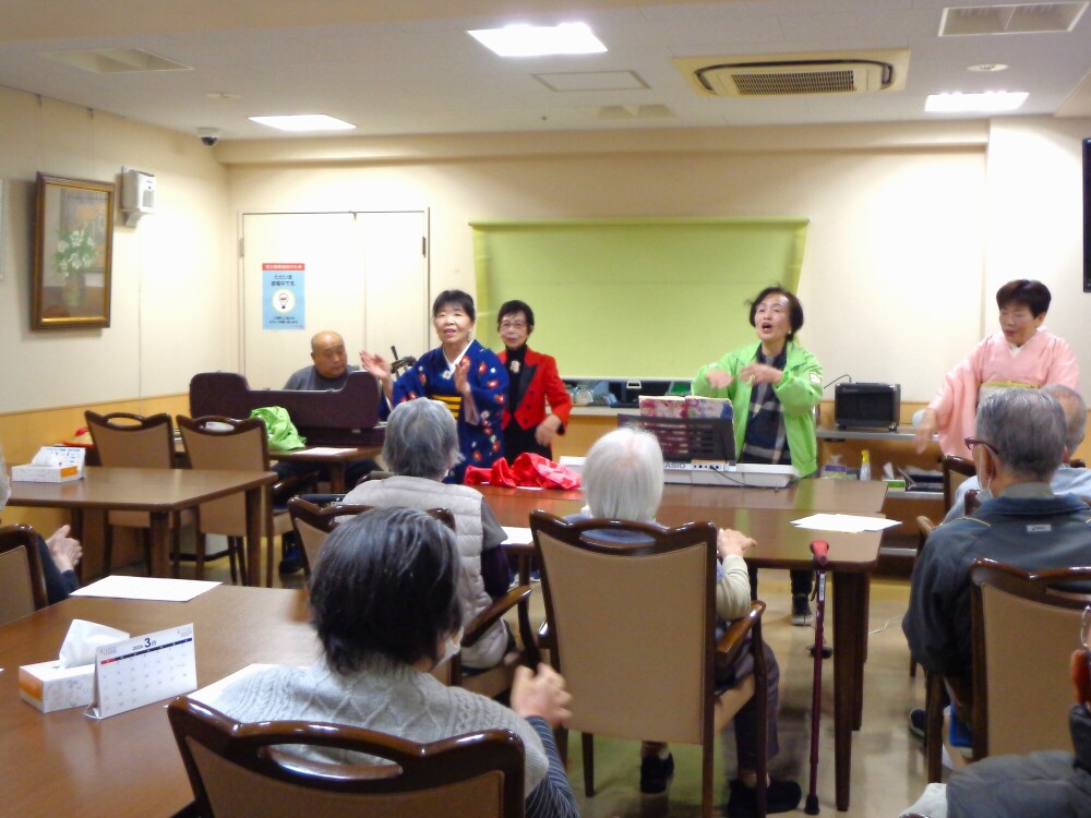 昨日3月18日、当住宅では地域で活動されるボランティアの皆様をお迎えし、**「民謡とマジックの二本立てショー」**を開催いたしました。