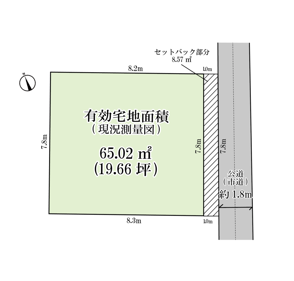 | 土地面積 | 65.02㎡【19.66坪】(他セットバック部分約8.57㎡) |